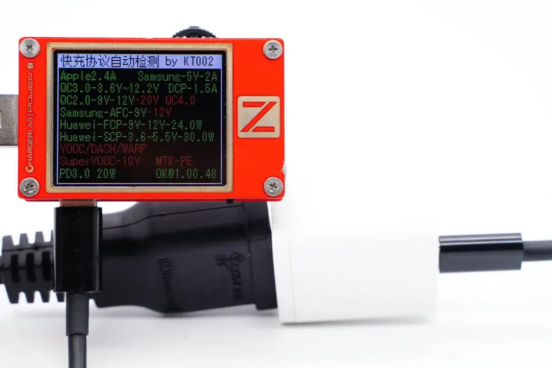 使用ChargerLAB POWER-Z KT002测得USB-A口支持Apple 2.4A、Samsung 5V2A、DCP协议,以及QC2.0/3.0、AFC、FCP、SCP快充协议。