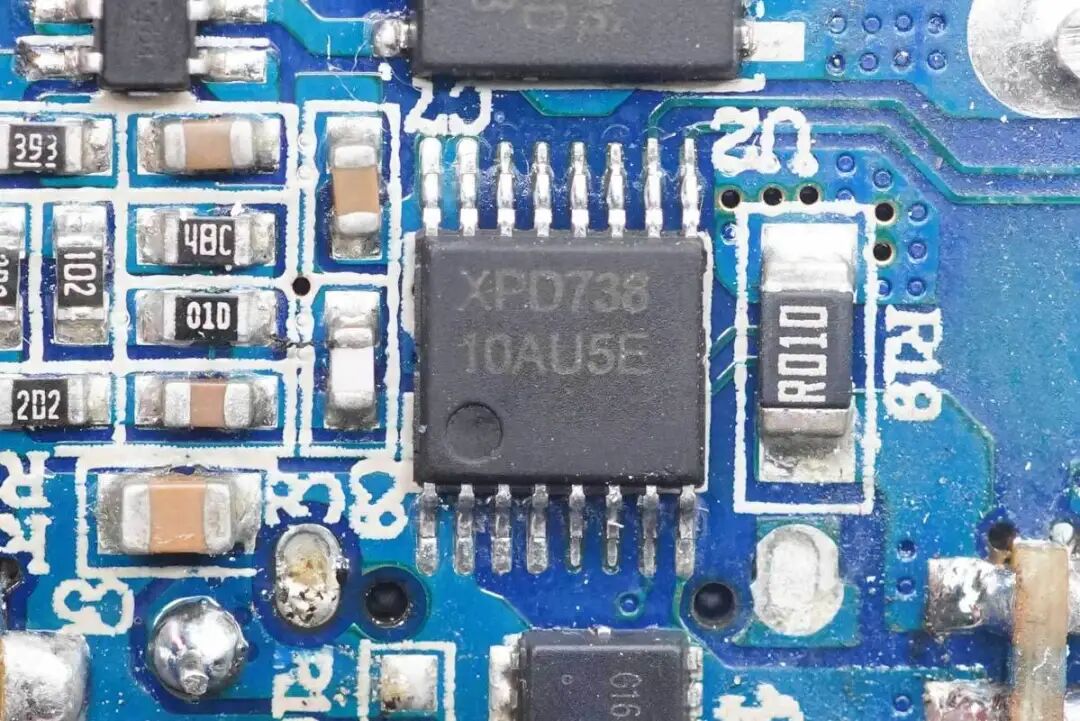 协议芯片采用云矽半导体XPD738,用于1C1A双口控制。XPD738通过了USB PD3.0认证(TID:3479),支持PD2.0/3.0、PPS、QC2.0/3.0、FCP、SCP、HVSCP、AFC等快充协议,很适合应用在1C1A双端口充电设备上,支持任意单口快充双口输出5V,在A口连接苹果充电线但未接入苹果手机时,C口仍然有快充。