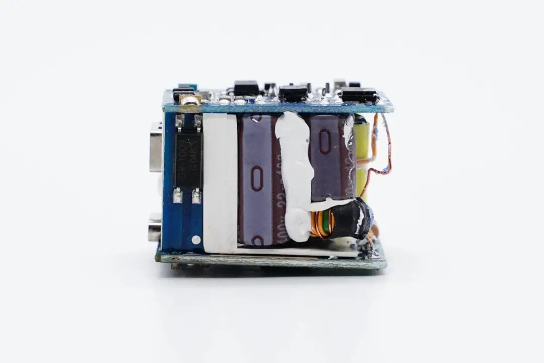 侧面两颗高压滤波电解电容打胶固定,并有白色塑料板进行隔离,连接小板上设有一颗光耦。