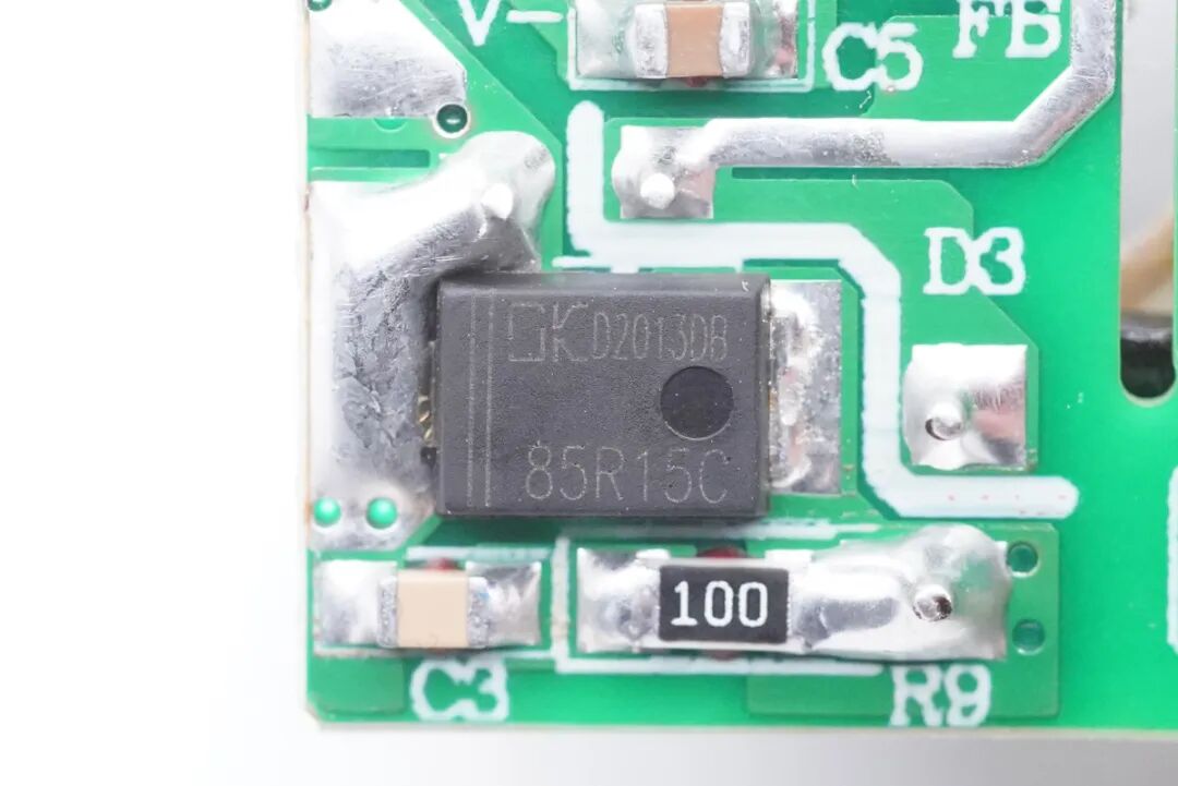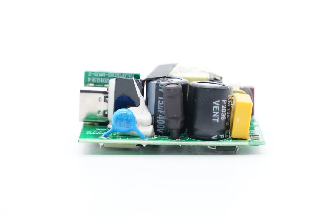 PCB板背面一览,白色光耦横跨在初次级之间,此外还有整流桥、主控芯片、次级同步整流芯片。
