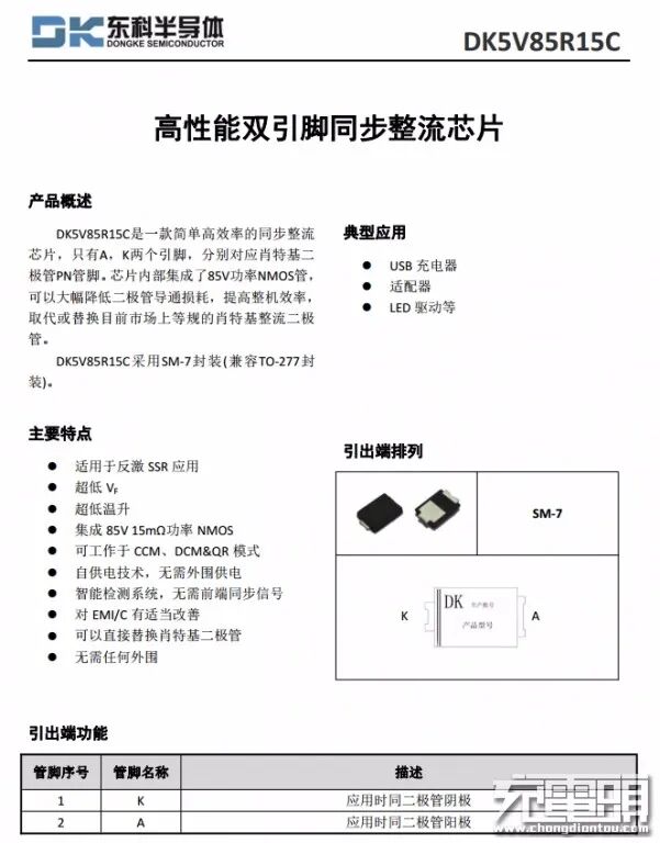 东科半导体高性能双引脚同步整流芯片DK5V85R15C,只有A,K两个引脚,分别对应肖特基二极管PN管脚;内部集成了85V功率NMOS管, 可以大幅降低二极管导通损耗,提高整机效率, 取代或替换目前市场上等规的肖特基整流二极管;采用SM-7封装(兼容TO-277封装)。