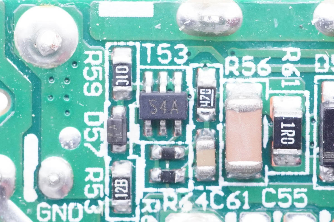 PCB板背面一览,初次级之间镂空以穿过塑料隔离板,右上角四颗二极管组成桥式整流,此外背面还有PWM主控芯片和光耦。