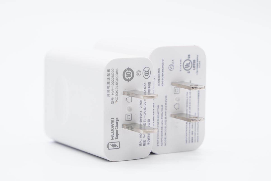 和华为新款10V2.25A 22.5W快充充电器相比,虽然外观ID一样,但机身更短也更宽一些。
