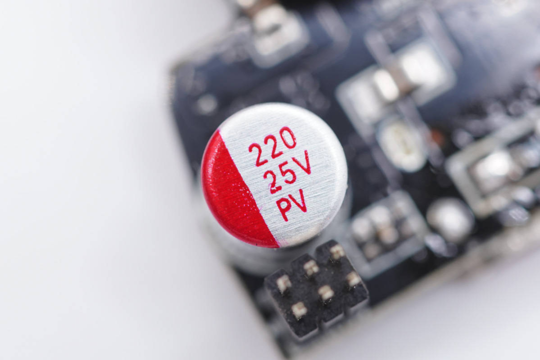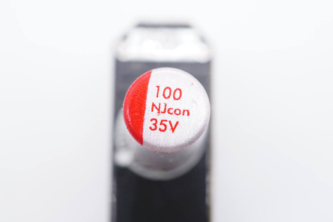 输入滤波固态电容特写,规格为35V 100μF,NJcon品牌。
