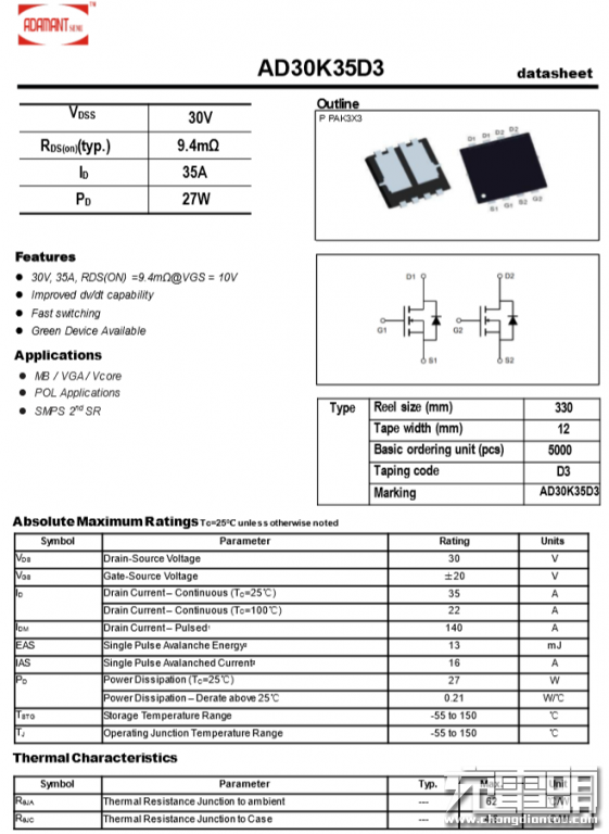 砹德曼AD40N40D3耐压40V,导阻6.5mΩ,采用PPAK3*3封装。(对应产品规格升级:AD40N50D3、AD40N60D5)