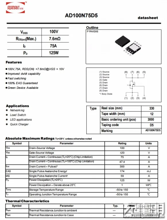砹德曼AD100N75D5耐压100V,导阻7.6mΩ,采用PPAK5*6封装。同系列产品还有AD100N60D5、 AD100N70D5、 AD100N70T2、AD100N80T2、AD100N145T2。