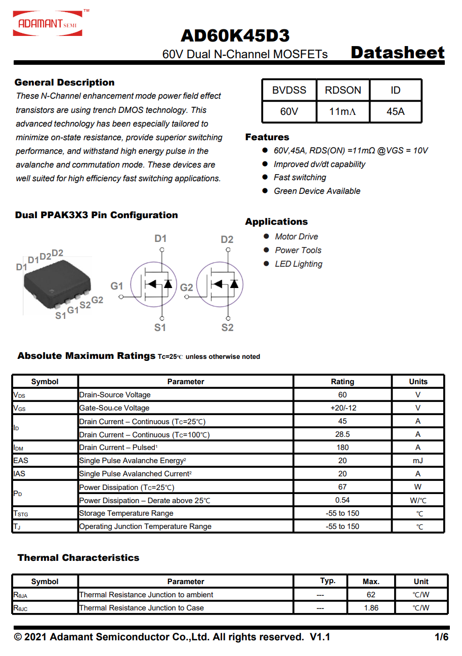 砹德曼AD60K45D3内置两个11mΩ的NMOS,耐压60V,采用PPAK3*3封装,节省面积。
