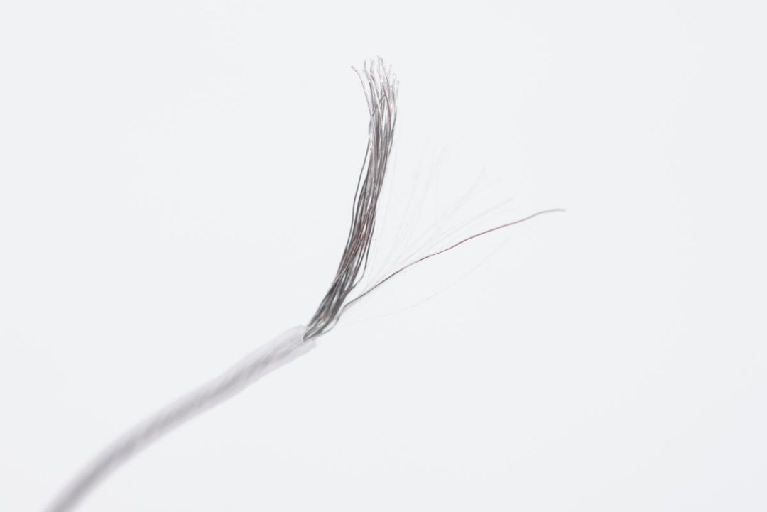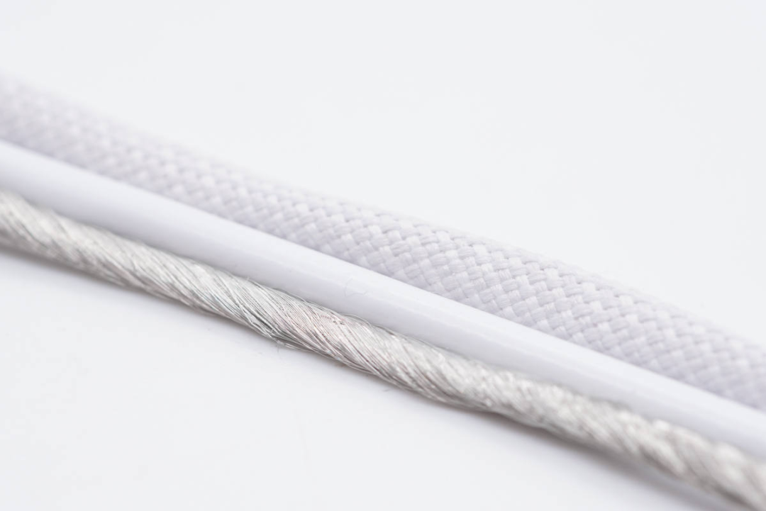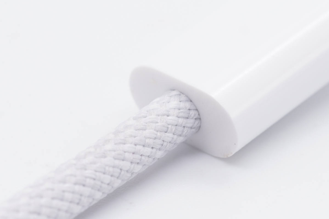 灰白相间的两股细丝通过加捻后以2+2交错的方式进行混编,不易起毛。另外相比起常见的TPE外皮抗磨损能力更加优越。