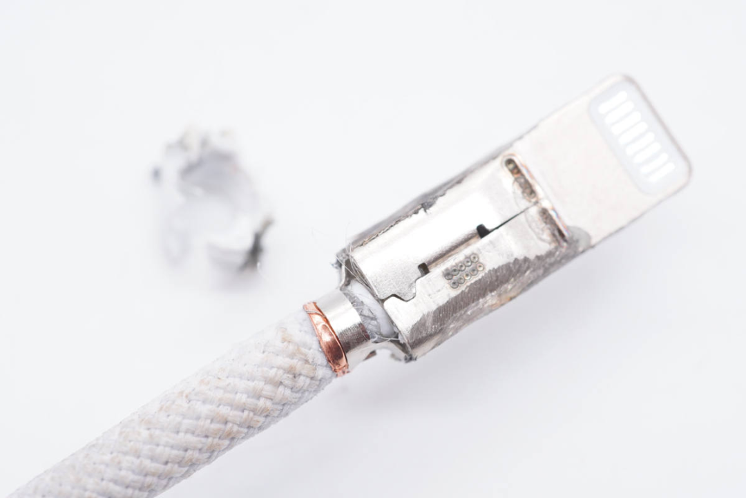 充电头网通过拆解了解到,这根苹果数据线的线头PCB板和线芯均注塑处理,提供加强的绝缘保护,同时外套钢套点焊包裹,保护性非常的好。线身内置屏蔽网、铝箔抗干扰,不仅线芯内掺有抗拉线,还有四根凯夫拉线,整体抗拉性能强。