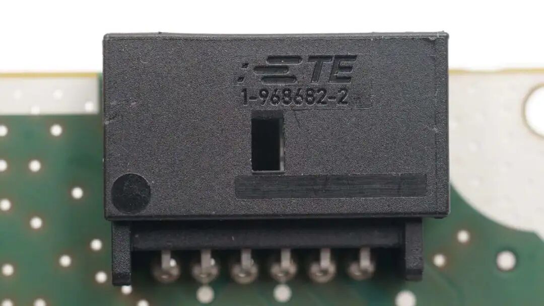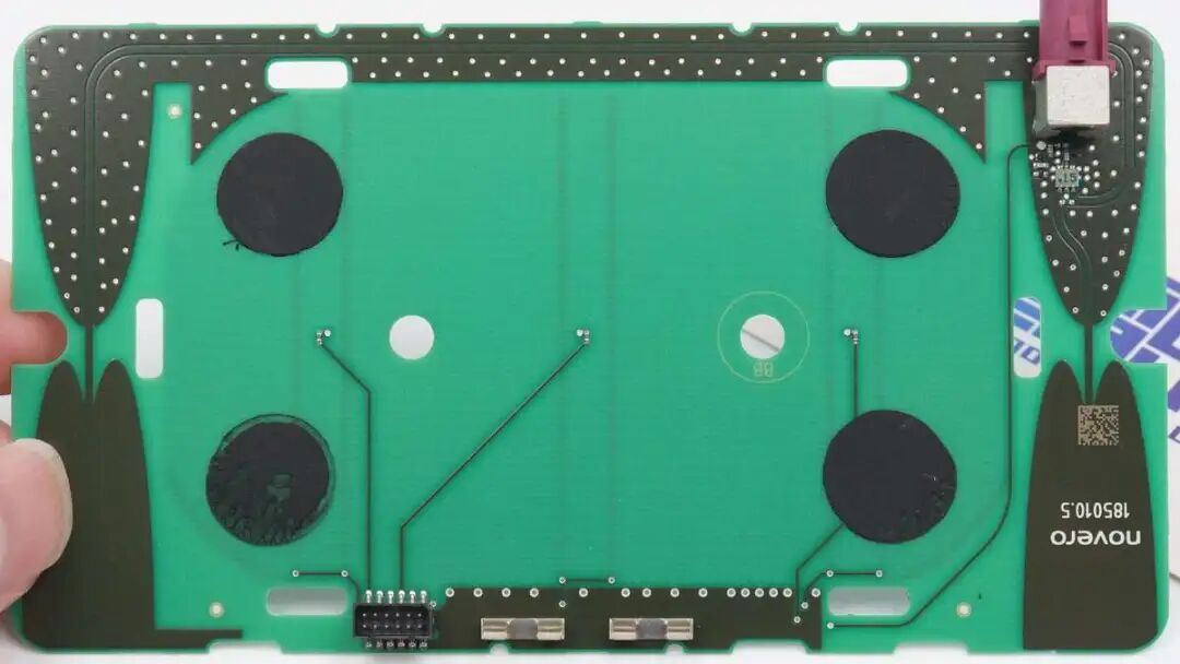 另一块PCB板对应塑料板区域,四端圆形黑胶用于固定塑料衬板。