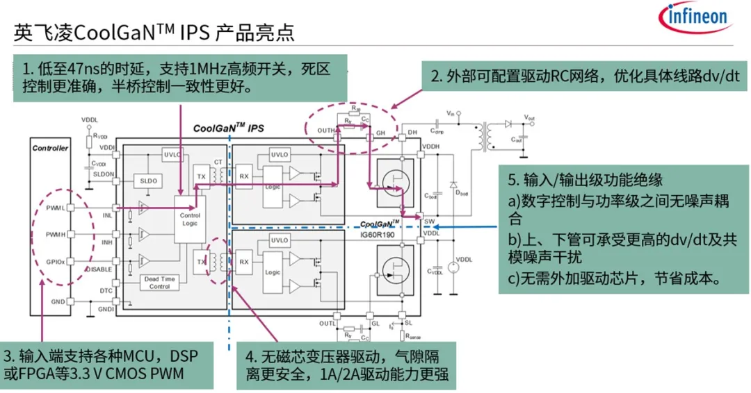 英飞凌CoolGaN IPS器件支持1MHz开关频率,时延低至47ns,使死区控制更准确,且半桥控制的一致性更好。并且驱动器输出可配置RC网络,优化线路电压上升率。输入信号支持MCU、DSP、FPGA等,支持PWM信号输入。内置无磁芯变压器提供可靠的驱动隔离,并且输入和输出级绝缘,可提供数字控制与功率级没有噪声耦合,并且功率级可承受更高的压摆率,同时无需外置驱动器,降低系统整体成本。