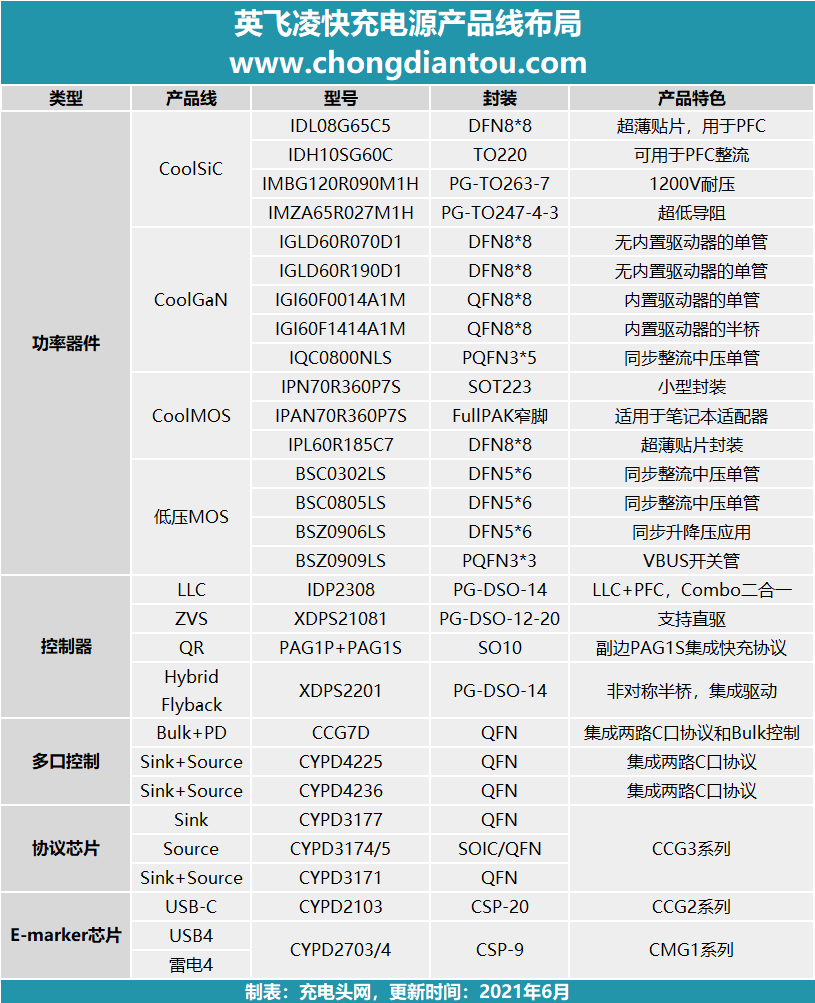 充电头网归纳的英飞凌快充电源产品线布局,涵盖从功率器件到初级控制器,协议芯片、多口控制芯片和数据线中的E-Marker芯片。