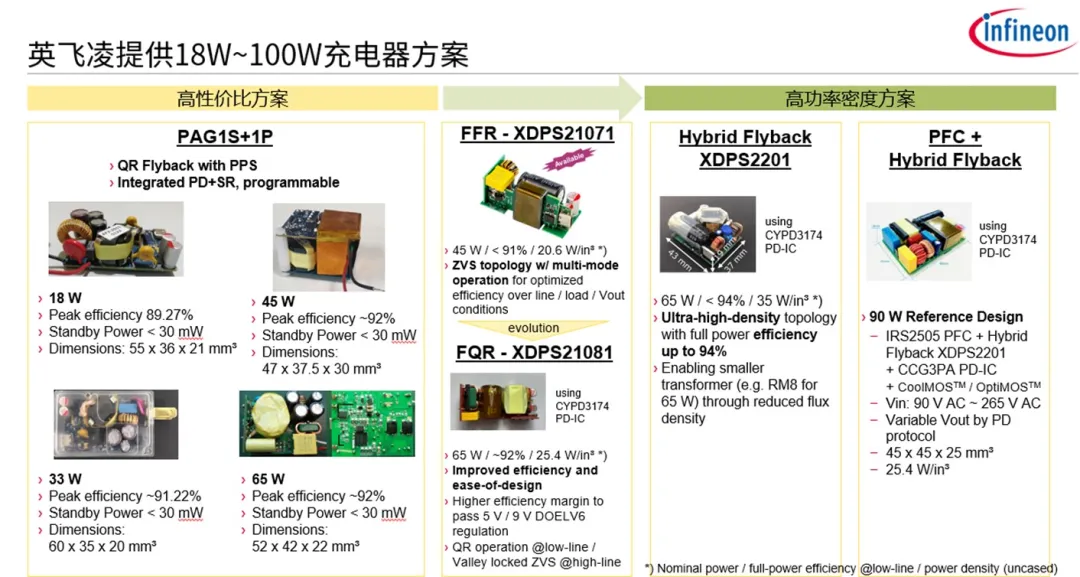 英飞凌推出基于PAG1S+1P的18-65W高性价比方案,基于XDPS21071的45W方案,基于XDPS21081的65W方案,以及基于XPDS2201的混合反激高功率密度解决方案。