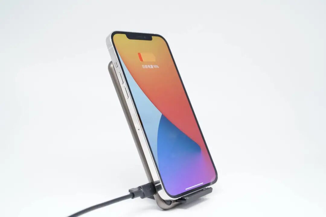将iPhone 12 Pro Max放上去即可进行立式无线充电,同时还支持横竖无线充,边充边刷剧使用体验更好。