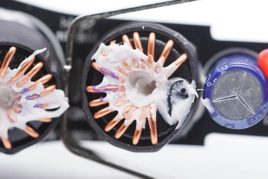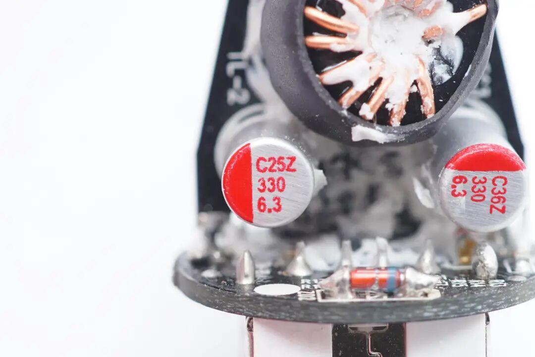 降压电感特写,外套热缩管与负极弹片绝缘保护,并打胶加固。