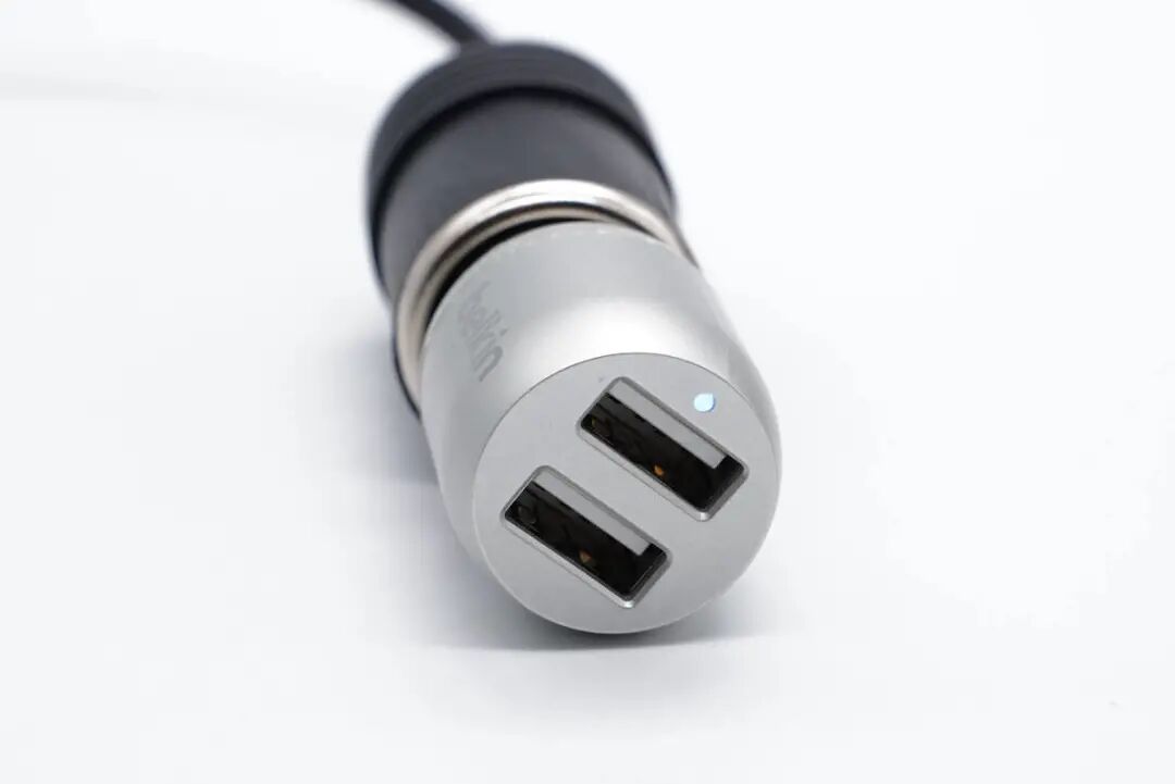 车充采用两段机身壳拼接设计,机身壳为PC塑料材质,表面喷刷银灰色涂料,看上去像金属质感,机身壳头部印有belkin品牌。
