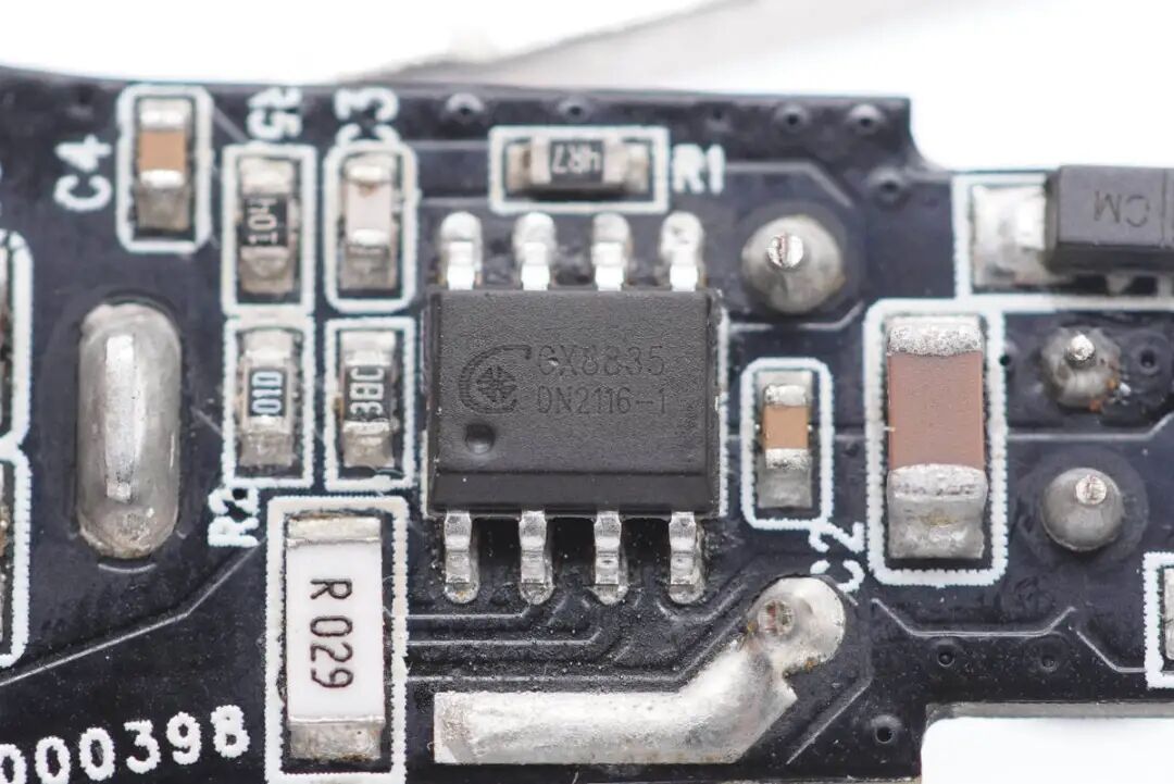 车充采用两路独立降压输出设计,两个A口的降压转换器均采用诚芯微的CX8835。这是一款输入耐压可达40V,并且能够实现精确恒压以及恒流的降压型DC-DC转换器,其内置80mΩ High-side PMOS以及20mΩ Low-side NMOS,可支持3A持续输出电流,输出电压可调,最大可支持100%占空比。