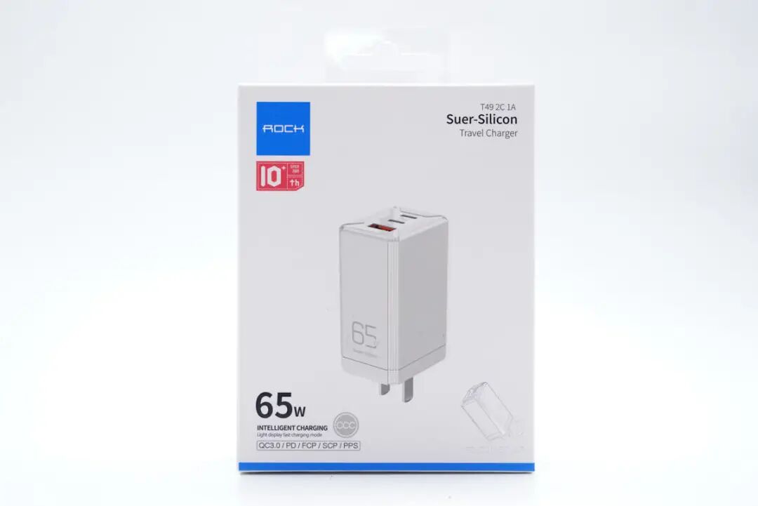 包装盒正面印有ROCK品牌、充电器外观以及特性信息等。