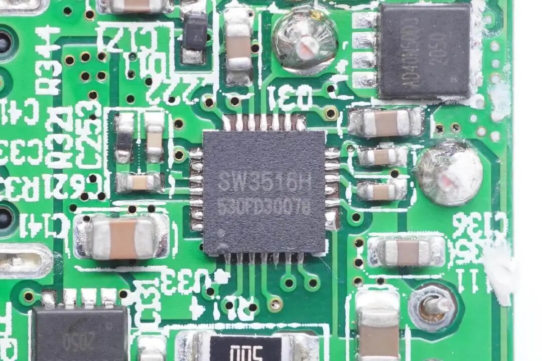 两路二次降压电路主控芯片均采用智融SW3516H,用于进行降压控制和协议识别。智融SW3516H是一款高集成度的多快充协议双口充电芯片,支持A+C口任意口快充输出,支持双口独立限流。