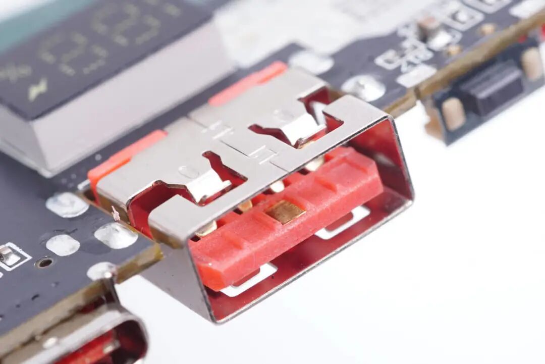 USB-A母座特写,沉板过孔焊接,前端具有特殊触点且正负极加宽。
