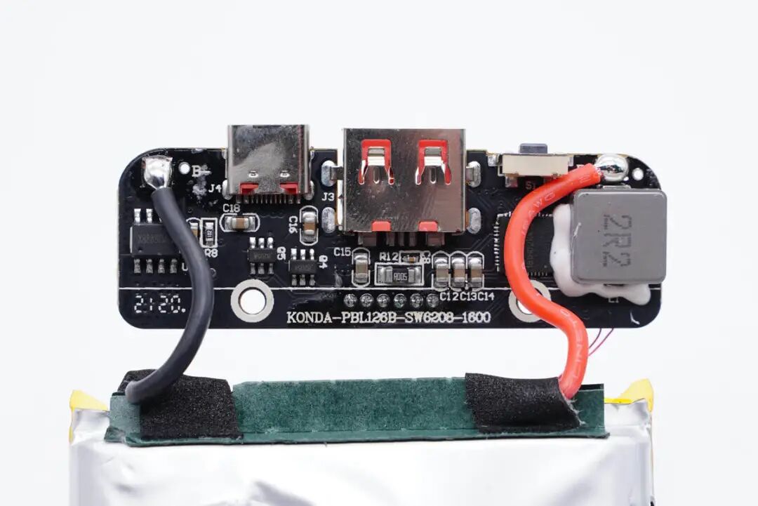 PCB板正面一览,右侧有移动电源主控芯片和电感,左侧有锂电保护芯片。