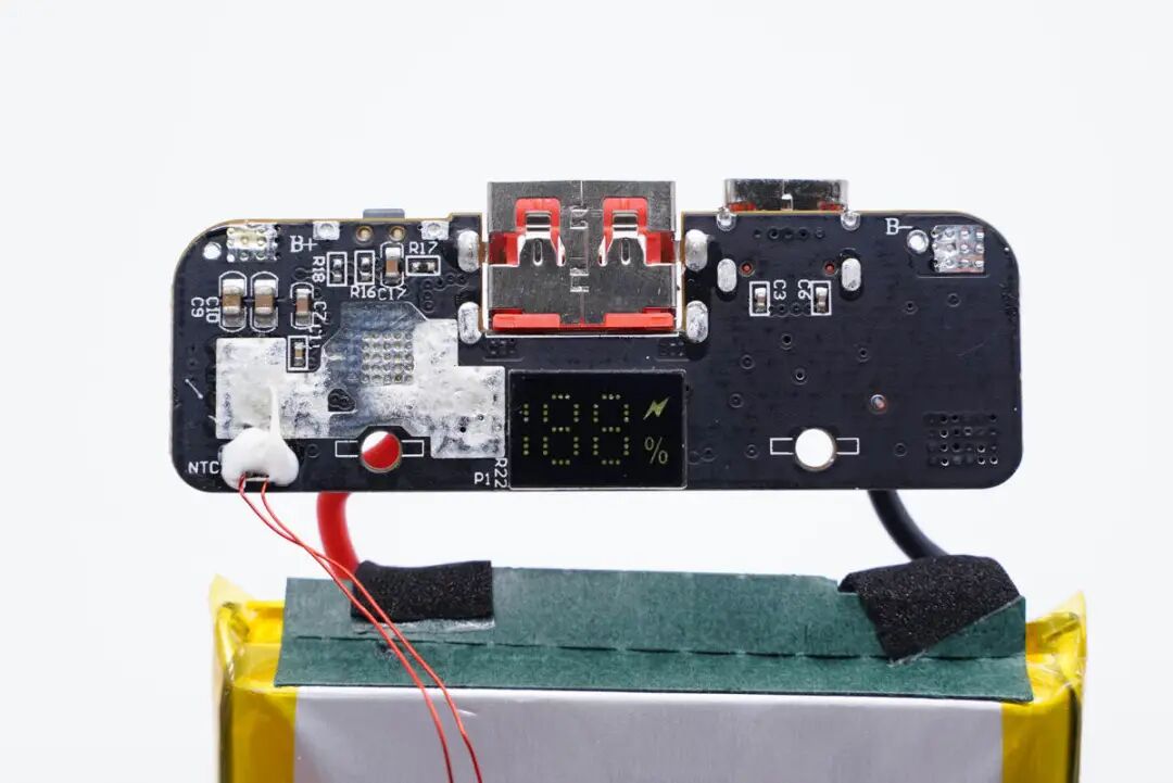 通过计算我们算出其电池的能量密度,按照能量密度公式:电池能量/体积=10000mAh*3.85V/12*62*80mm,转换单位可知该电池的能量密度为646.84Wh/dm。对比市面上最常见的1260110电池,能量密度为467.17Wh/dm,能量密度相较提高了38%,这就是该款充电宝轻薄的核心原因。