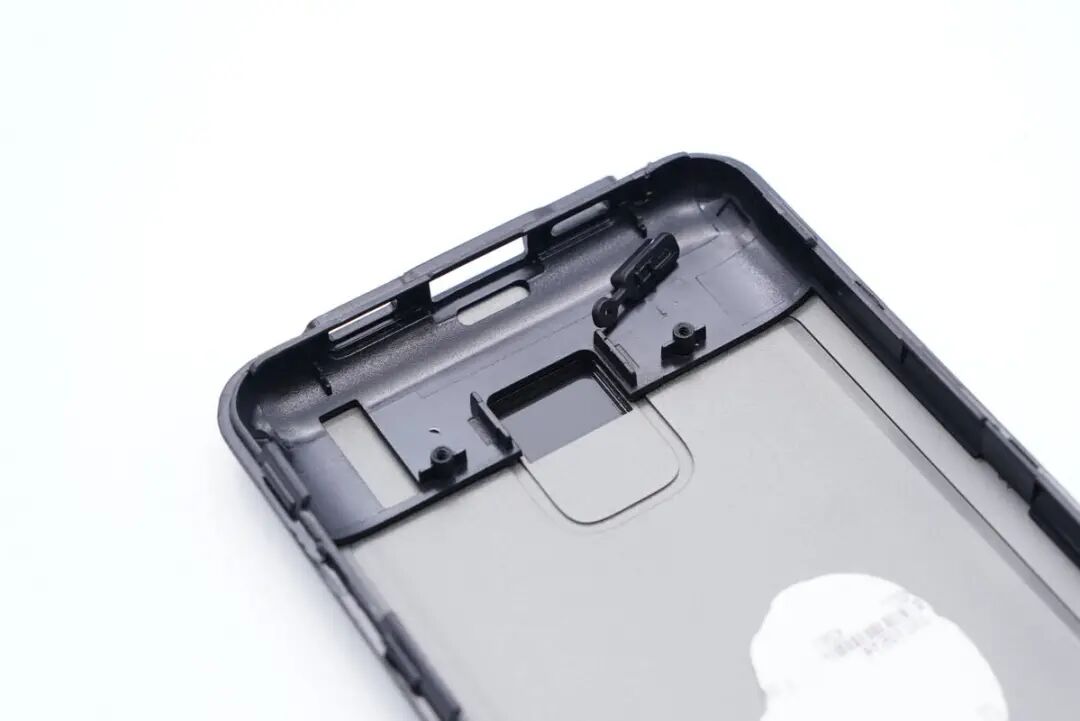 将机身壳拆开,两半金属壳通过边缘塑料壳卡扣封装固定,电芯打胶固定。