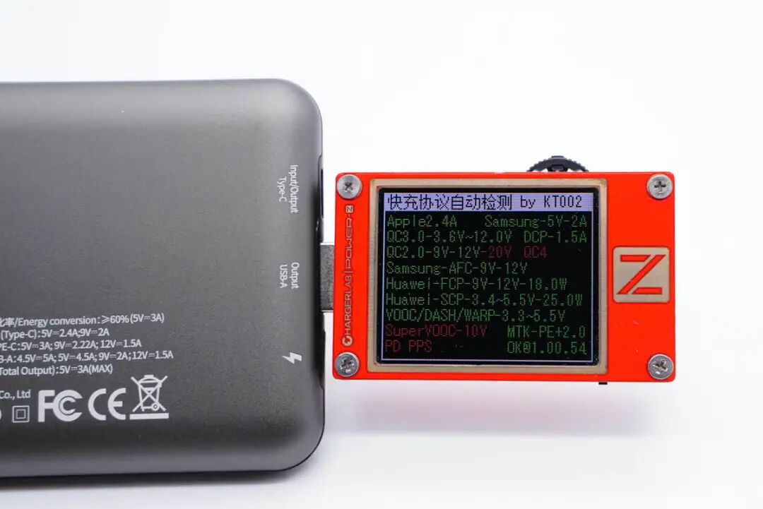使用KT002测得USB-C口支持QC2.0/3.0、AFC、FCP、SCP、PE2.0、PD3.0和PPS快充协议。