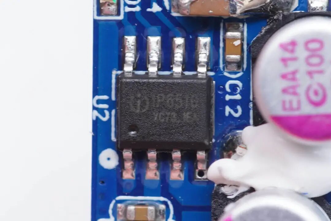 USB-C口电路主控芯片采用英集芯IP6510,进行降压和协议识别控制输出电压。这是一款内建同步降压转换器、支持9种输出快充协议、支持Type-C和USB PD协议的车充、多口快充、快充插排的完整解决方案。采用ESOP8封装,可有效减少外围元件。
