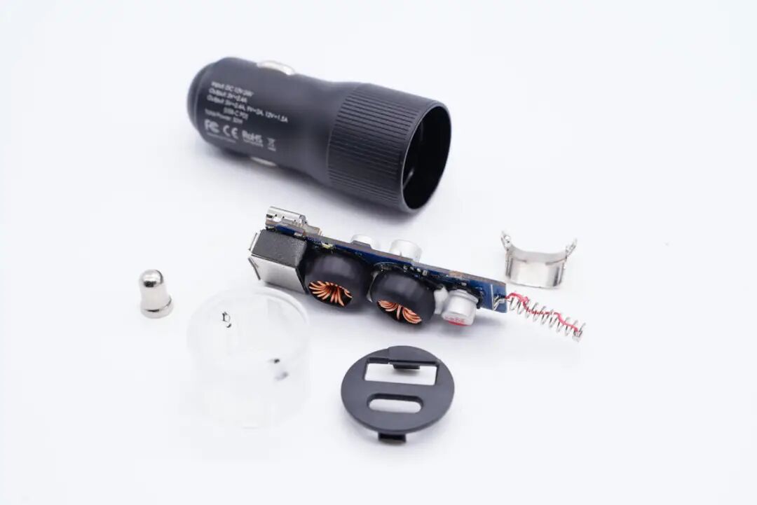 充电头网通过拆解了解到,车充内置两路独立降压电路,USB-A口采用宝砾微PL8322降压5V输出;USB-C口采用英集芯IP6510进行降压和协议识别,实现快充输出。车充设有输入输出滤波电容,而且采用的钰邦品牌,降压电感做了绝缘加固。产品的整体用料做工还不错。