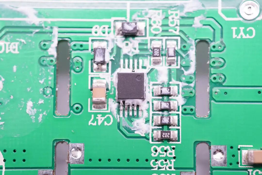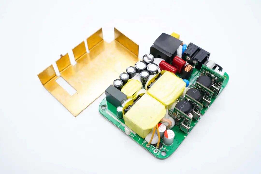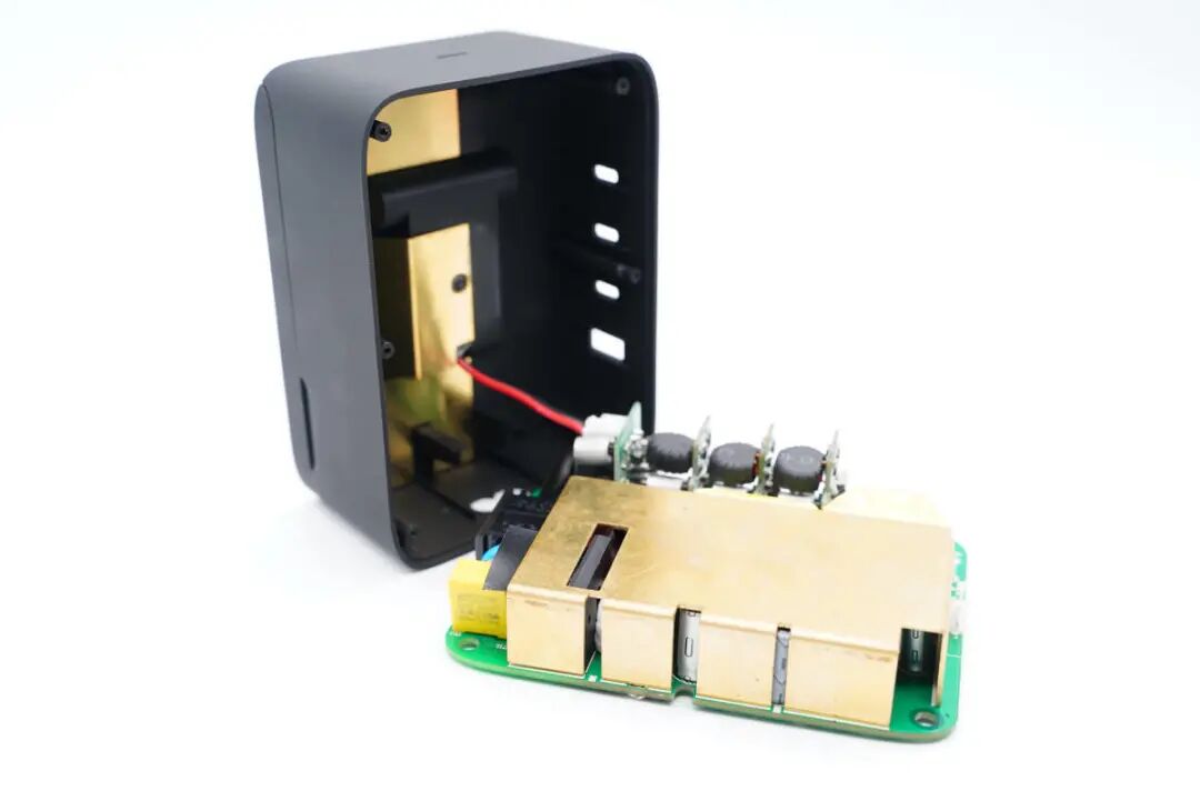 PCB板使用固定柱固定,导热垫下是三颗氮化镓功率芯片。