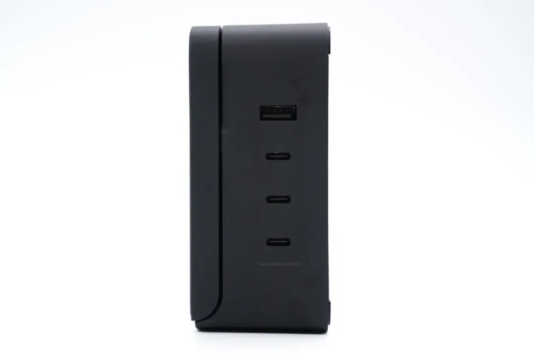 充电器底座一侧设有3C1A四个USB接口,均采用黑色胶芯,浑然一体。