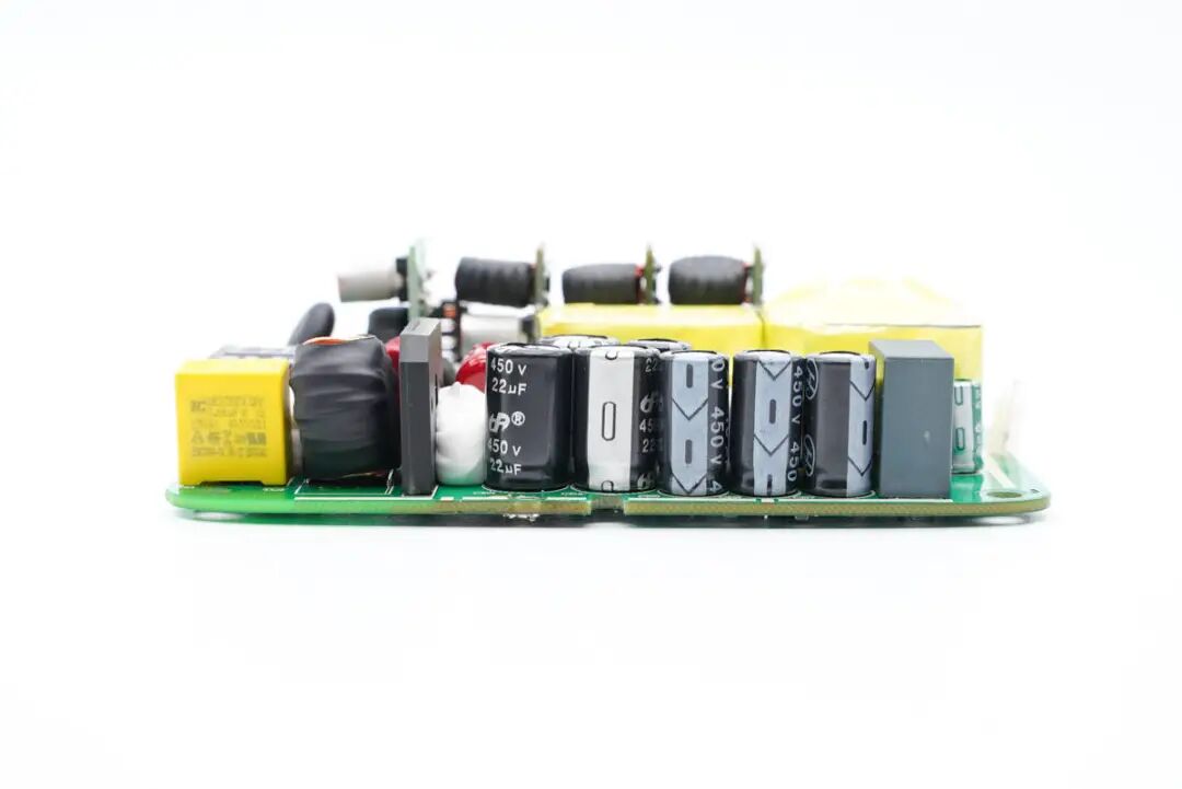 另一端有主控芯片供电电容、PFC升压电感、变压器、指示灯、输出滤波固态电容等。