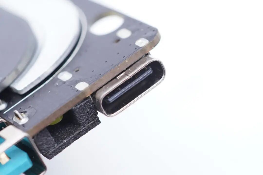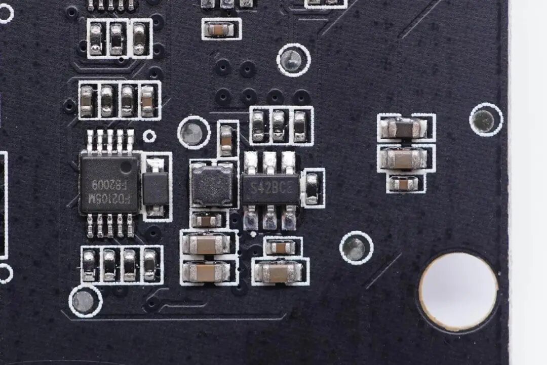 PCB板正面一侧印有nimble品牌logo,电容对应区域电路板镂空降低厚度。