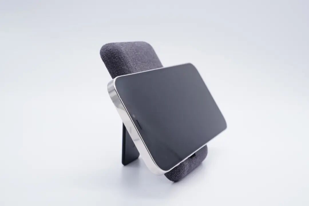 无线充支架正面采用布艺工艺设计,侧身倾斜边角圆润,最低端设有一个塑料支撑平台。
