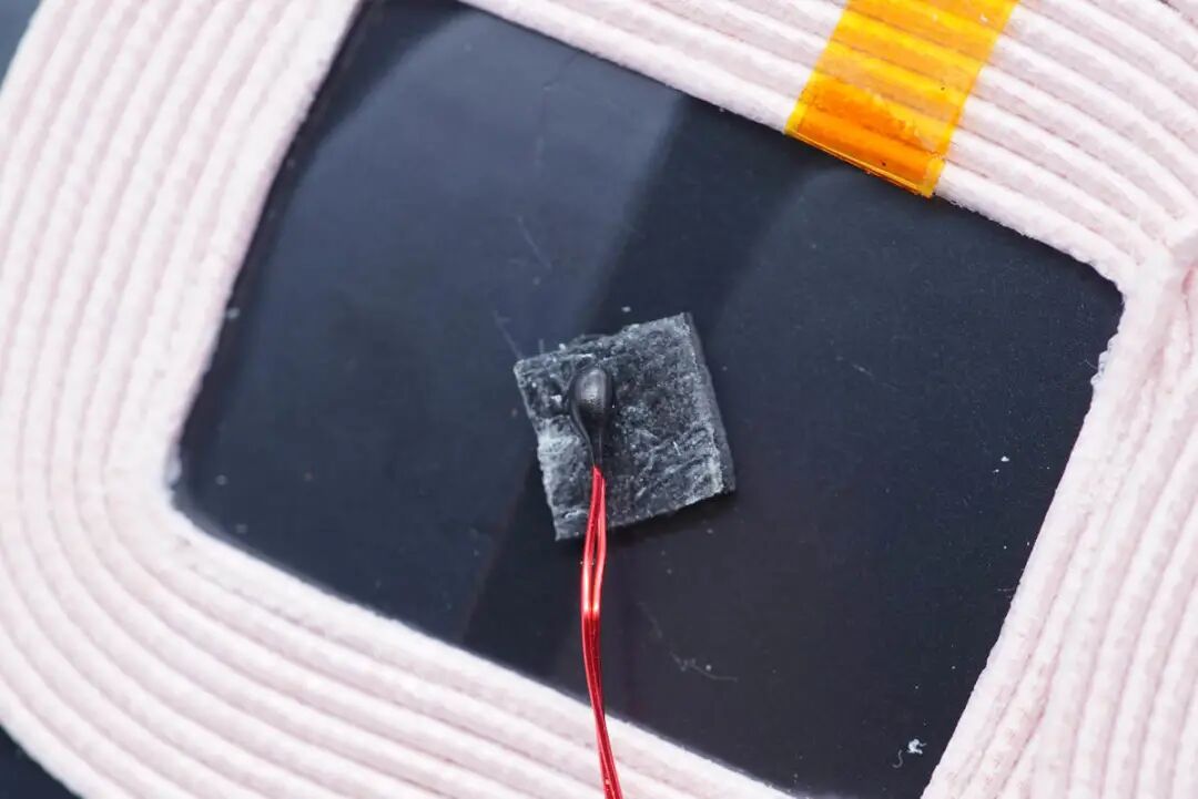 另一面有两个无线充电线圈,隔磁片下有金属散热板帮助散热,此外还有热敏电阻进行温度监控。