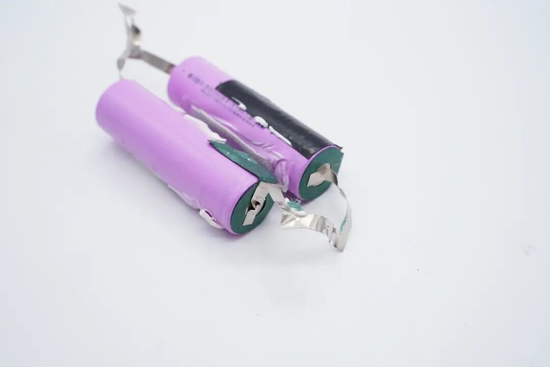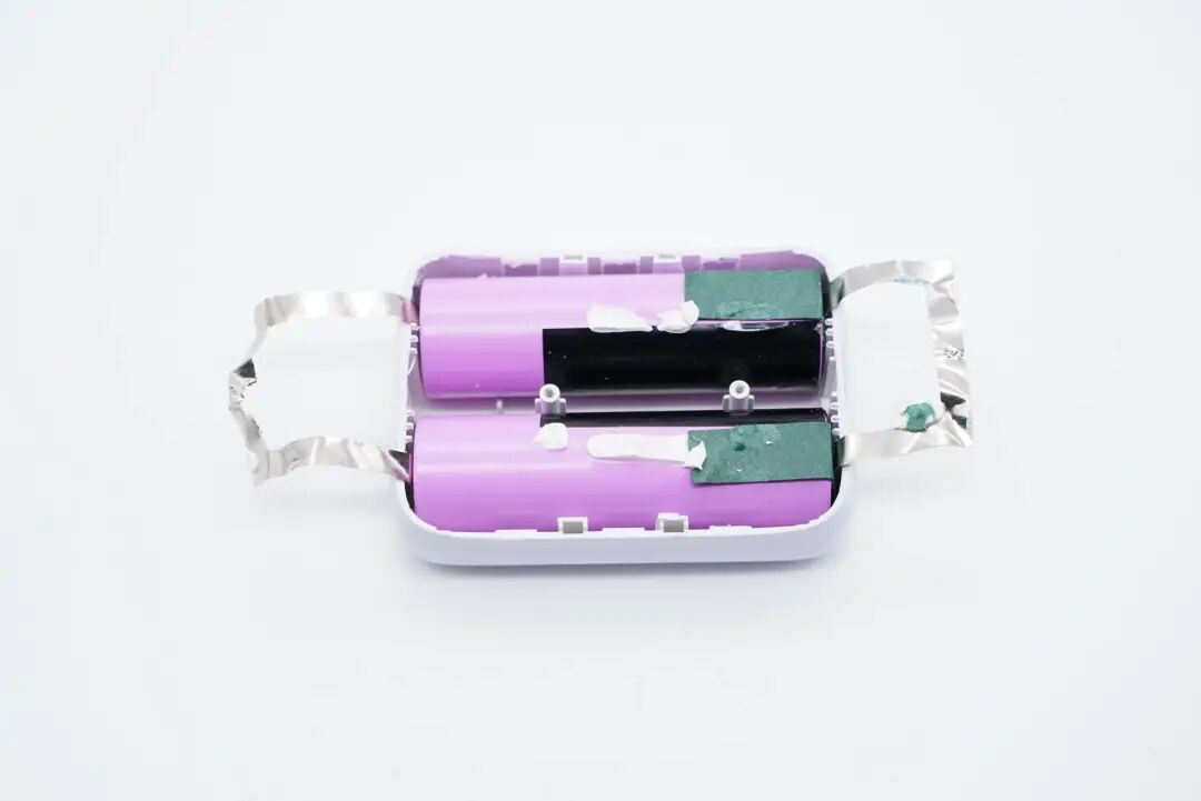 两颗锂电池通过镍片并联,贴有青稞绝缘纸和黑色绝缘胶带进行绝缘保护。