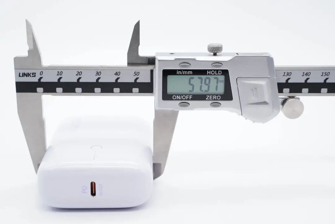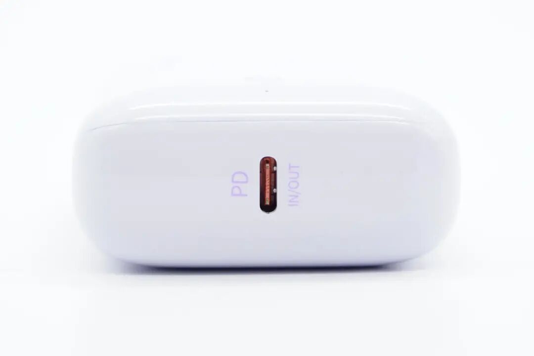 充电宝机身一端居中设有一个USB-C接口,两旁分别印有PD和IN/OUT字样,表示支持PD快充输入以及输出。