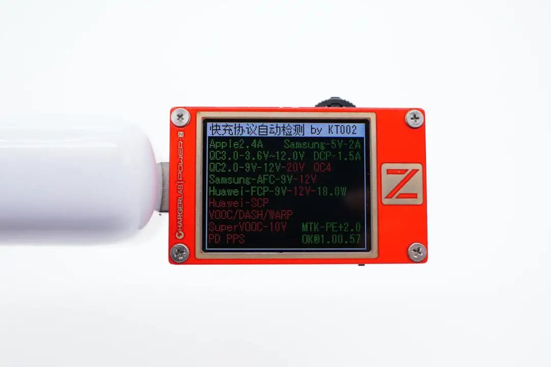 使用ChargerLAB POWER-Z KT002检测USB-A口输出协议,显示支持Apple 2.4A、Samsung 5V2A、DCP协议,以及QC2.0/3.0、AFC、FCP、PE2.0快充协议。