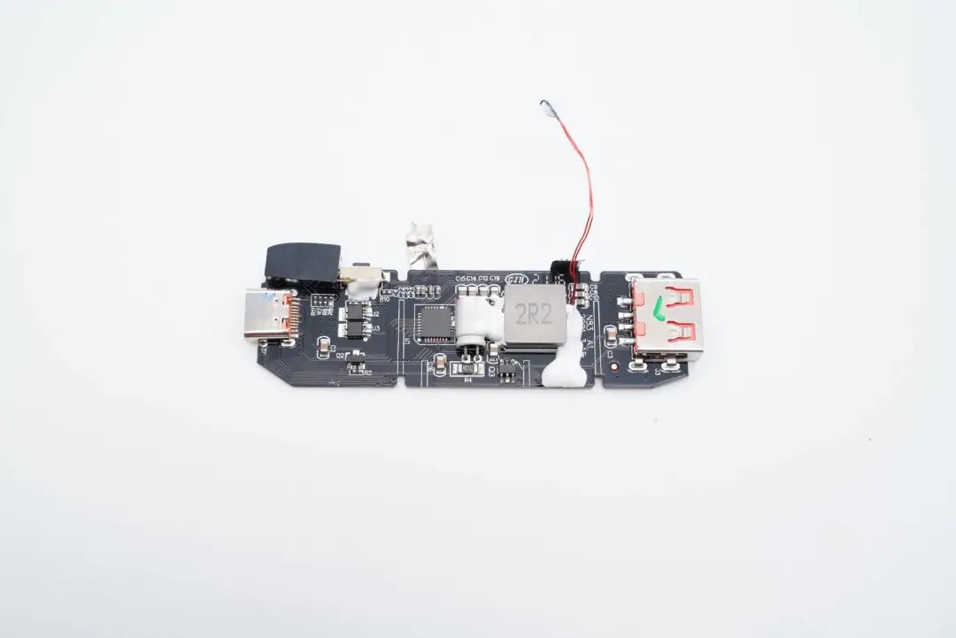 PCB板正面一览,设有移动电源主控芯片、滤波电容和电感等,电感电容打胶加固,两个USB母座置于小板两侧。