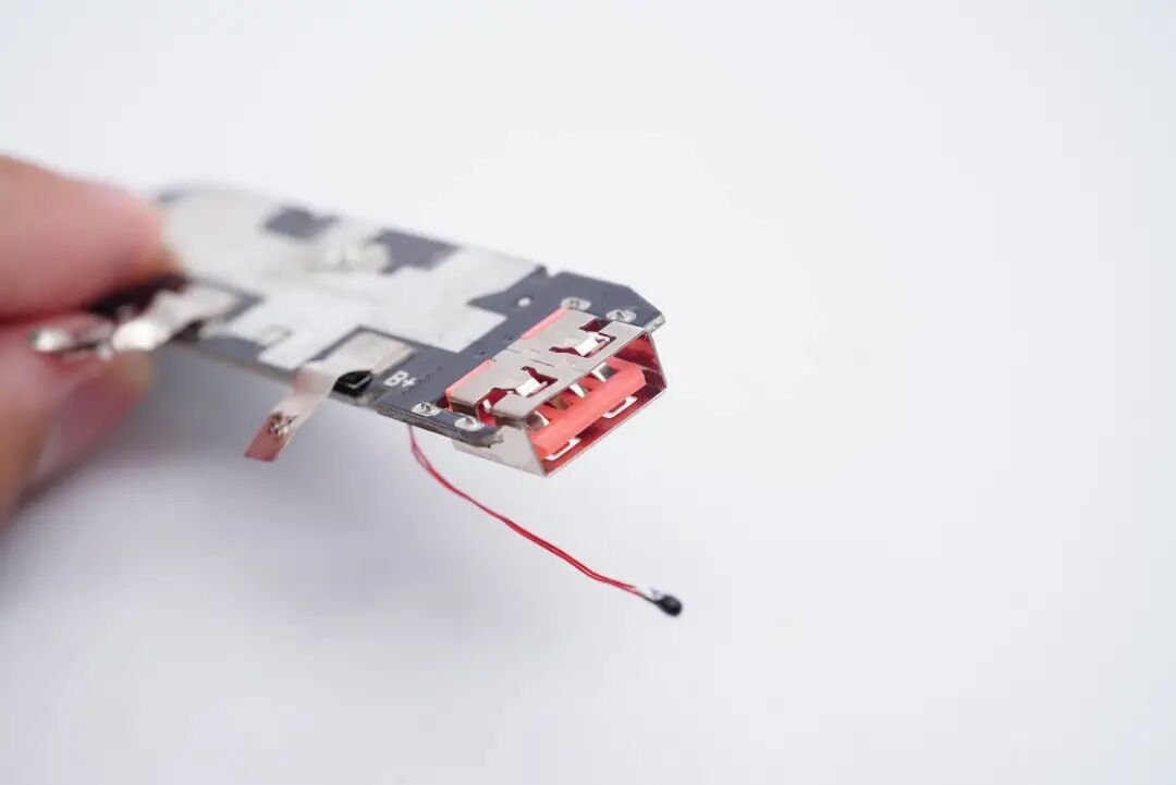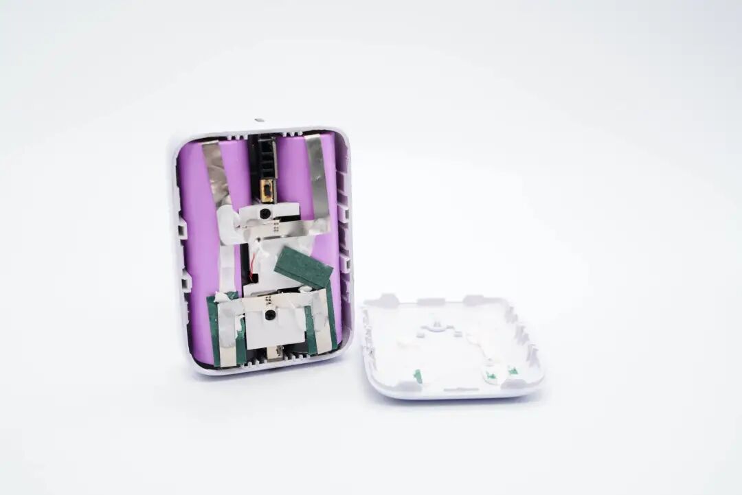 充电宝中间放置PCB小板,上方盖一块白色塑料板帮助固定。