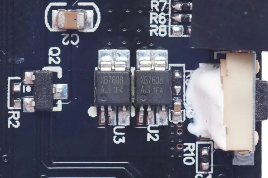 两颗赛芯微XB7608多合一锂电保护芯片,内置14.5mΩ导阻MOS管,外围元件只需要一颗电容,支持过热保护,过充保护,支持过放电保护和短路保护,其内部集成高精度电压检测,超低静态电流。