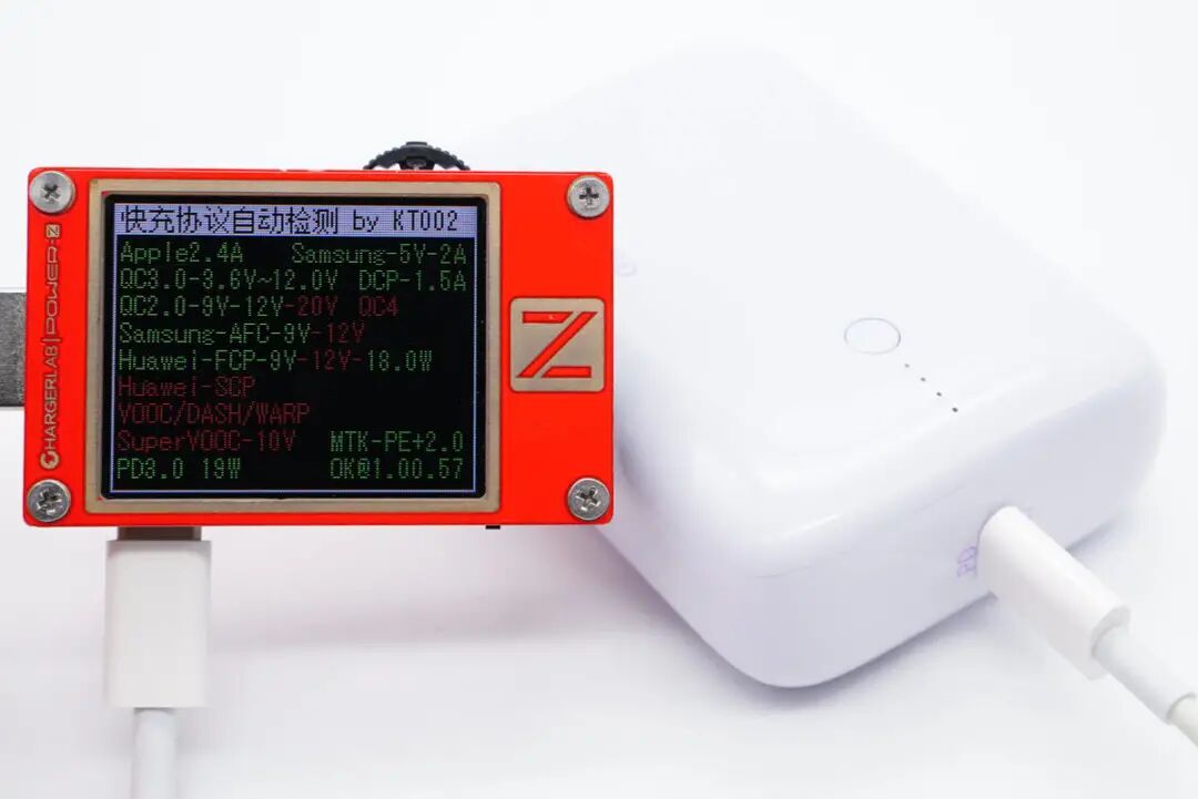 另外使用KT002测得USB-C口支持Apple 2.4A、Samsung 5V2A、DCP协议,以及QC2.0/3.0、AFC、FCP、PE2.0、PD3.0快充协议。
