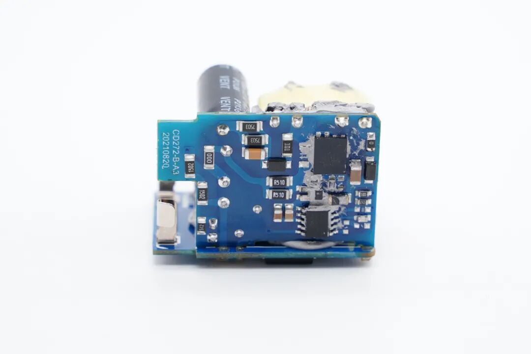 正面次级侧设有贴片Y电容和同步整流控制器,固态滤波电容已被拆掉。