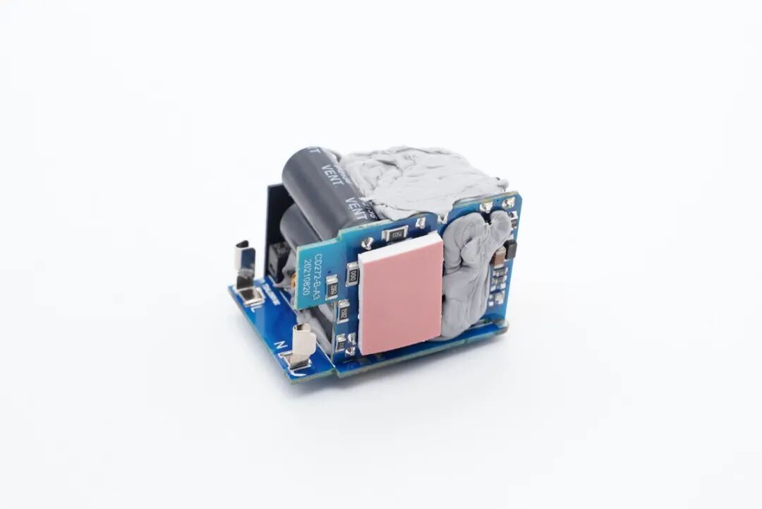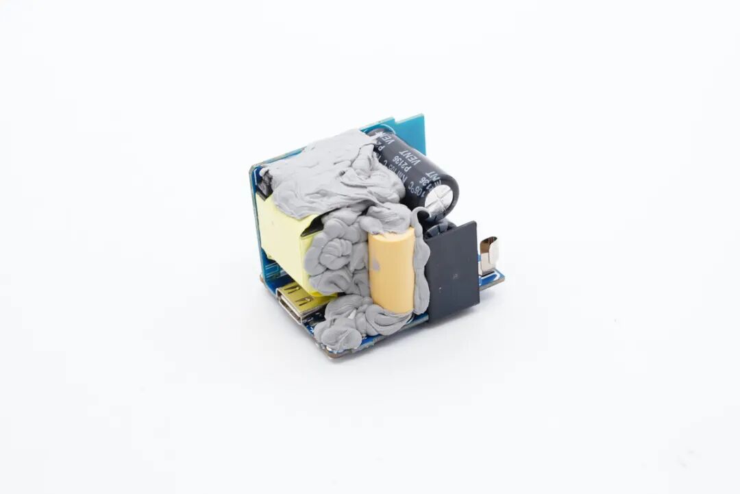 充电头网通过拆解了解到,充电器采用两块小PCB板组合焊接,L型结构设计,电容、变压器等器件打胶加固,电容套有绝缘胶套,初次级间设有隔离板,做工可靠。