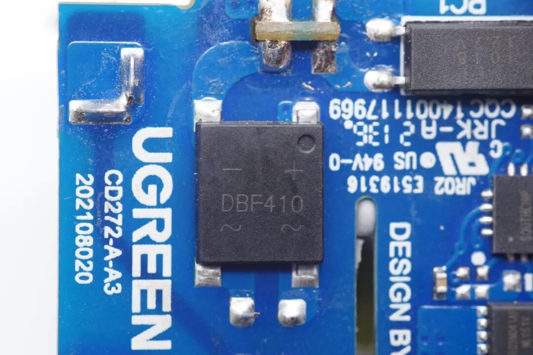 将硅胶清理干净,通过观察发现充电器采用高频QR开关电源架构,协议芯片控制输出电压,下面我们从输入端开始一一了解各器件的信息。