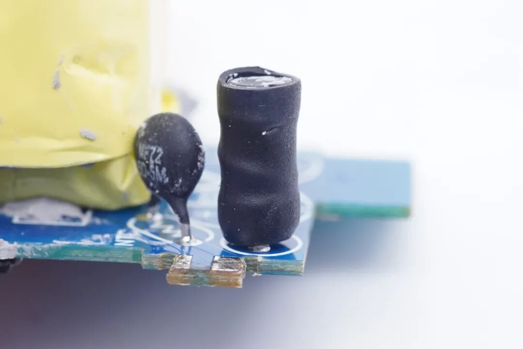 输入端两侧焊接金属片,接触式通电,另外可以看到有延时保险丝、共模电感、工字电感以及两颗高压滤波电解电容。