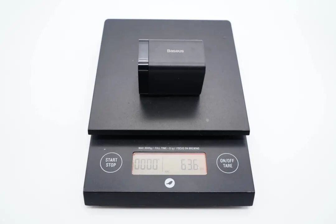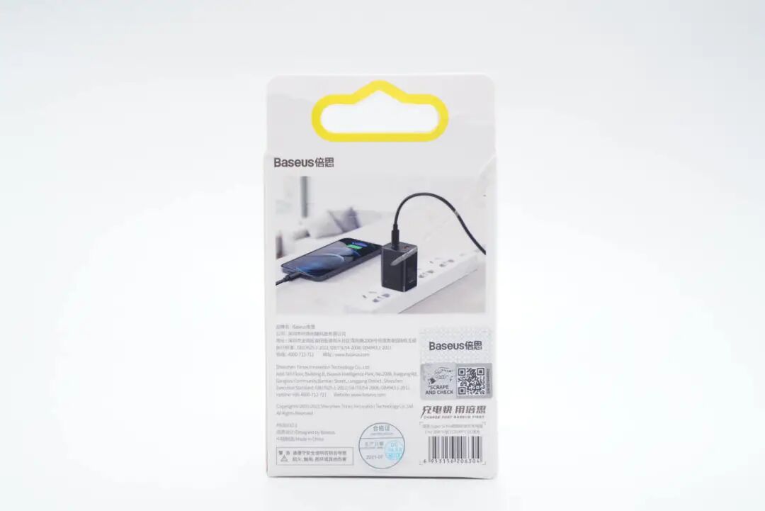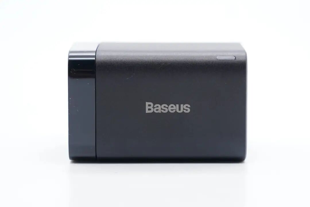 充电器采用黑色PC材质外壳,主体部分为磨砂的哑光表面,防滑耐刮,输入端部分为亮面壳体;正面印有Baseus字样,角落设有一颗LED电源指示灯。