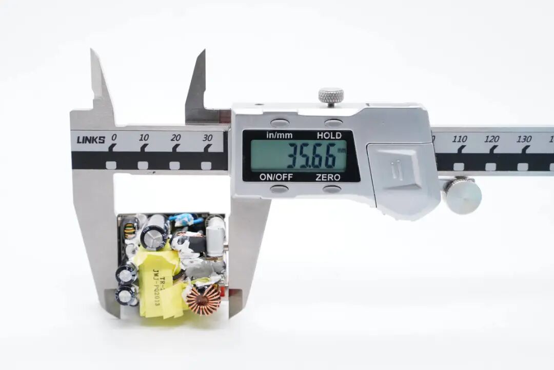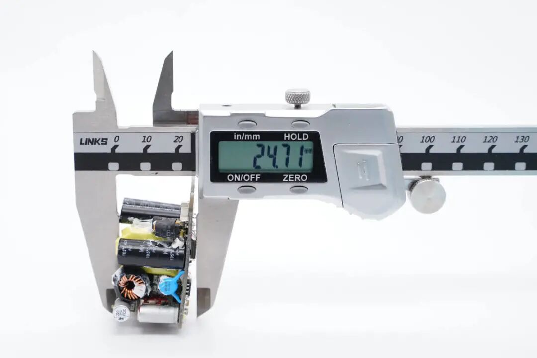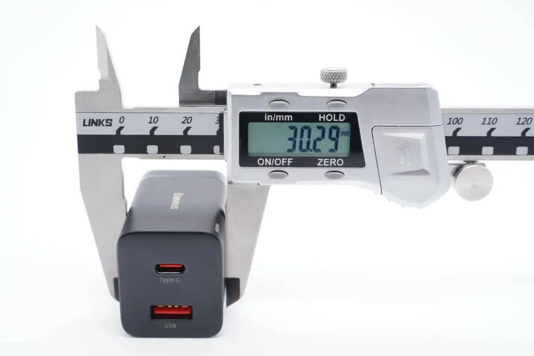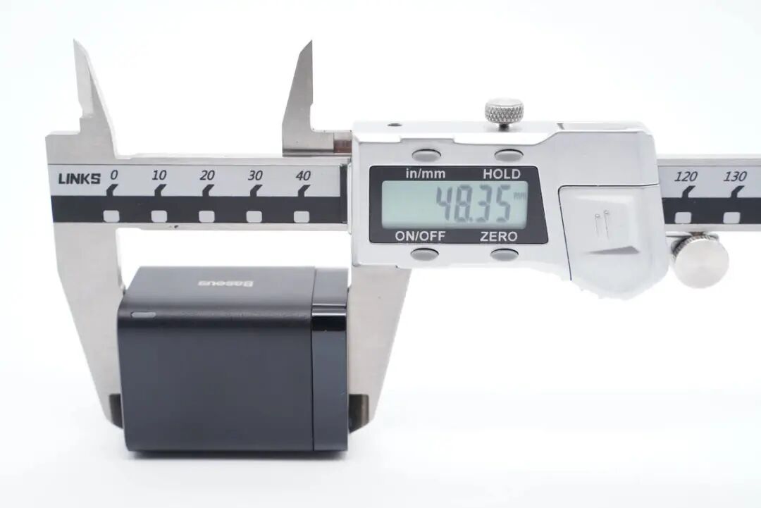 使用游标卡尺实测充电器机身长度为48.4mm。