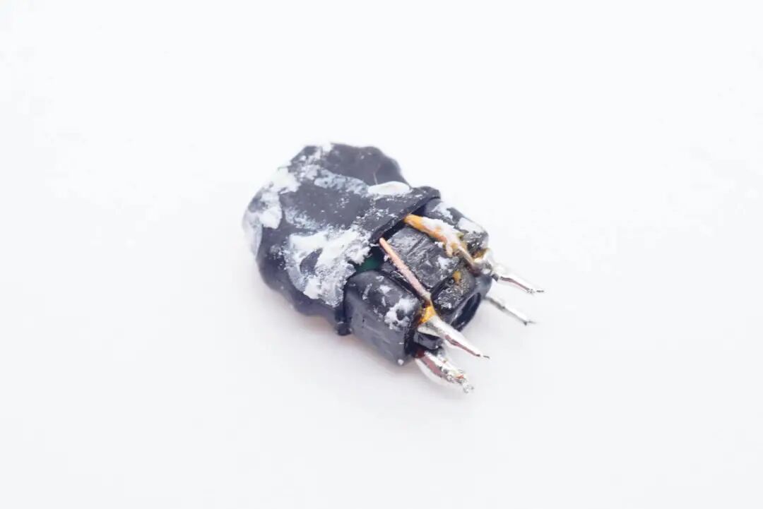 PCB板正面的元器件之间注满白色硅胶,起到固定元器件和增强散热的作用。